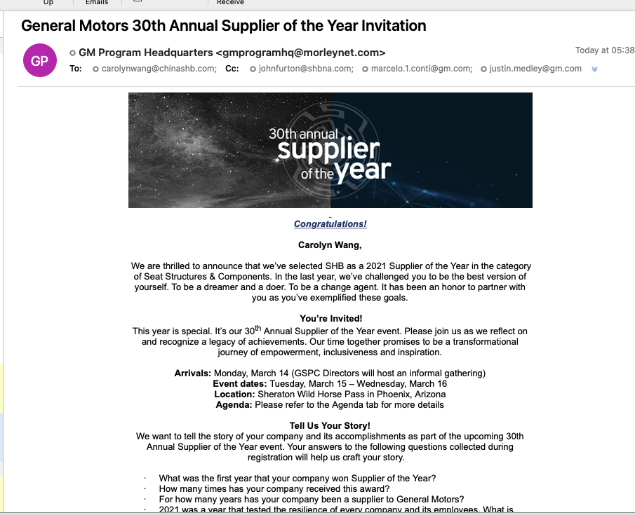Good news! SHB Electric Co., Ltd once again won the "Supplier of the Year" award of North American General Motors